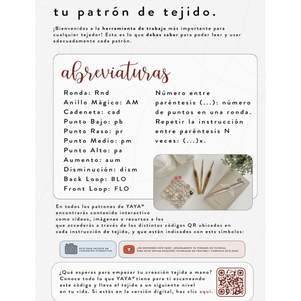 Incluye enlaces que te llevan a videos detallados, proporcionando claridad sobre los pasos cruciales del proceso. Estos recursos audiovisuales aseguran una comprensión completa, guiándote de manera visual a lo largo de tu proyecto de tejido, para que puedas crear con confianza y precisión. ¡Descubre una experiencia de aprendizaje enriquecida con los patrones de Yaya!